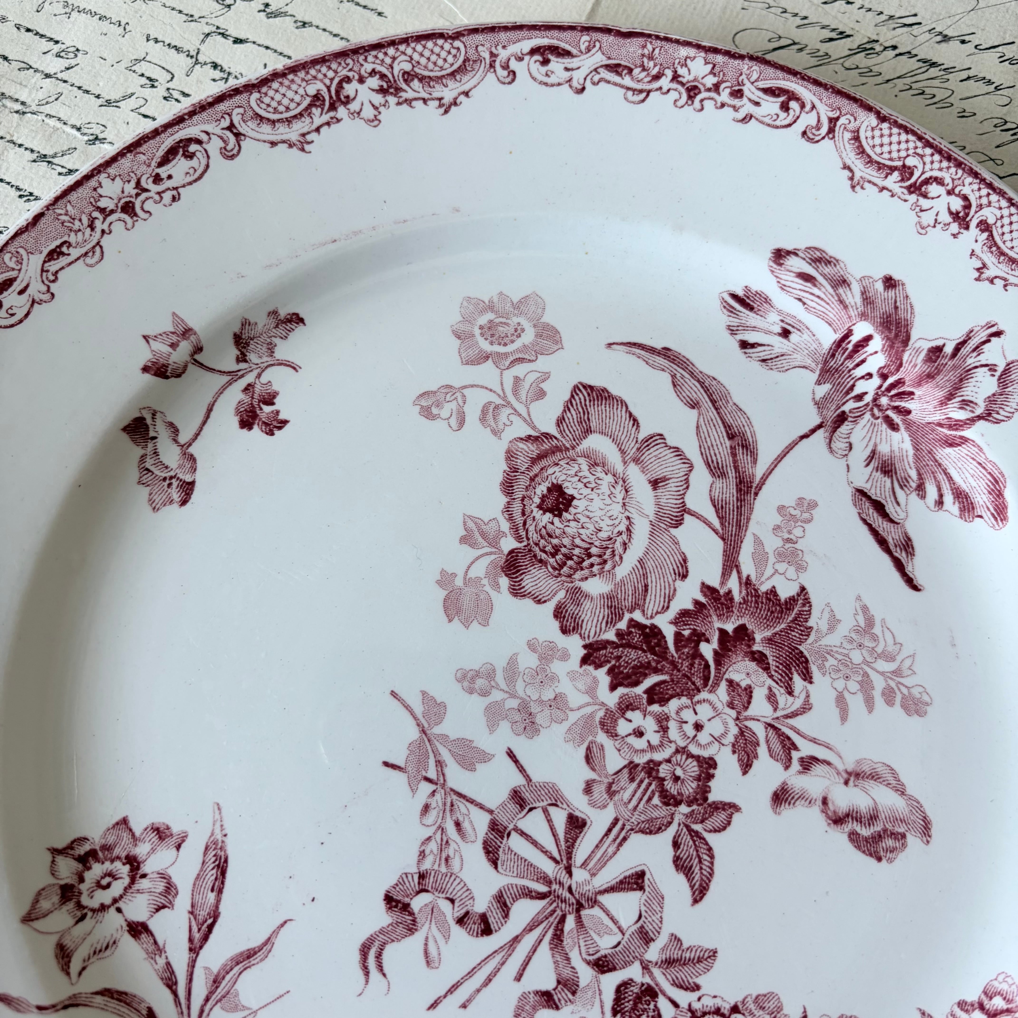 しっとりとしたTerre de Fer(テールドフェール)の陶肌と、深みのあるルージュの転写プリント、年月を経た自然な風合いがアンティークならではの魅力。