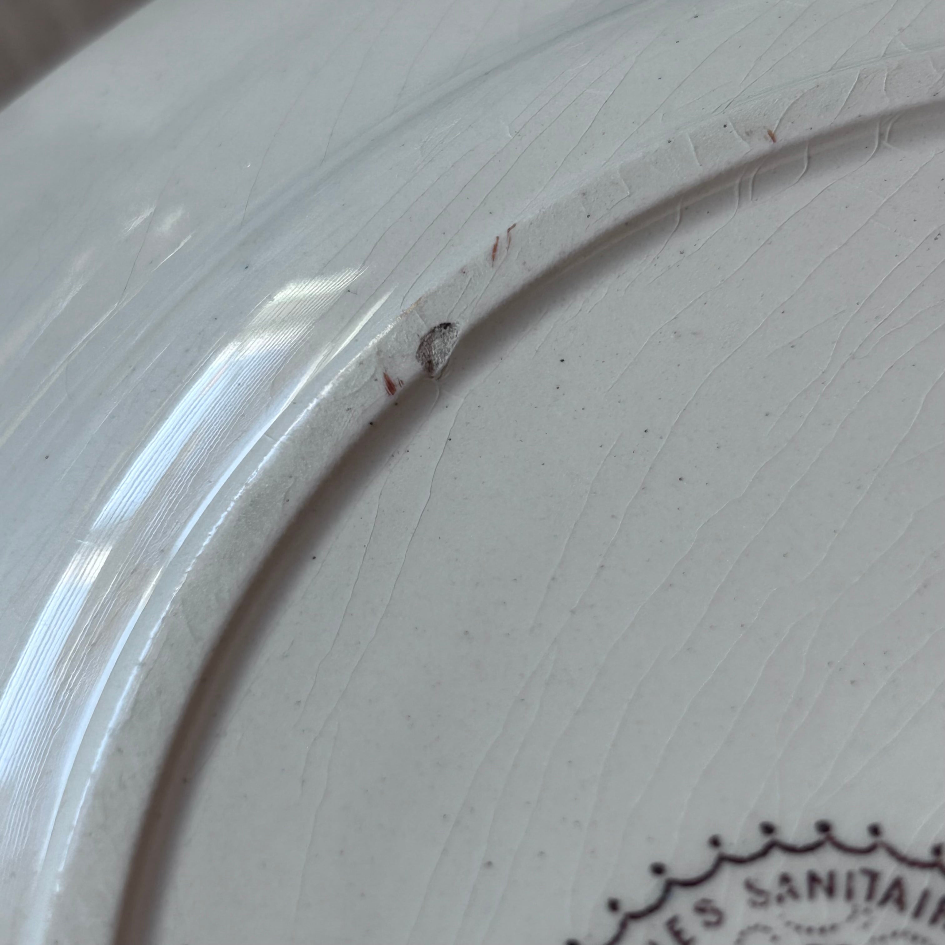 高台に小さなチップあり。その他貫入等経年劣化、釉薬のムラ、インクのトビは見られますがつややかで、良好なアンティークコンディションです。
