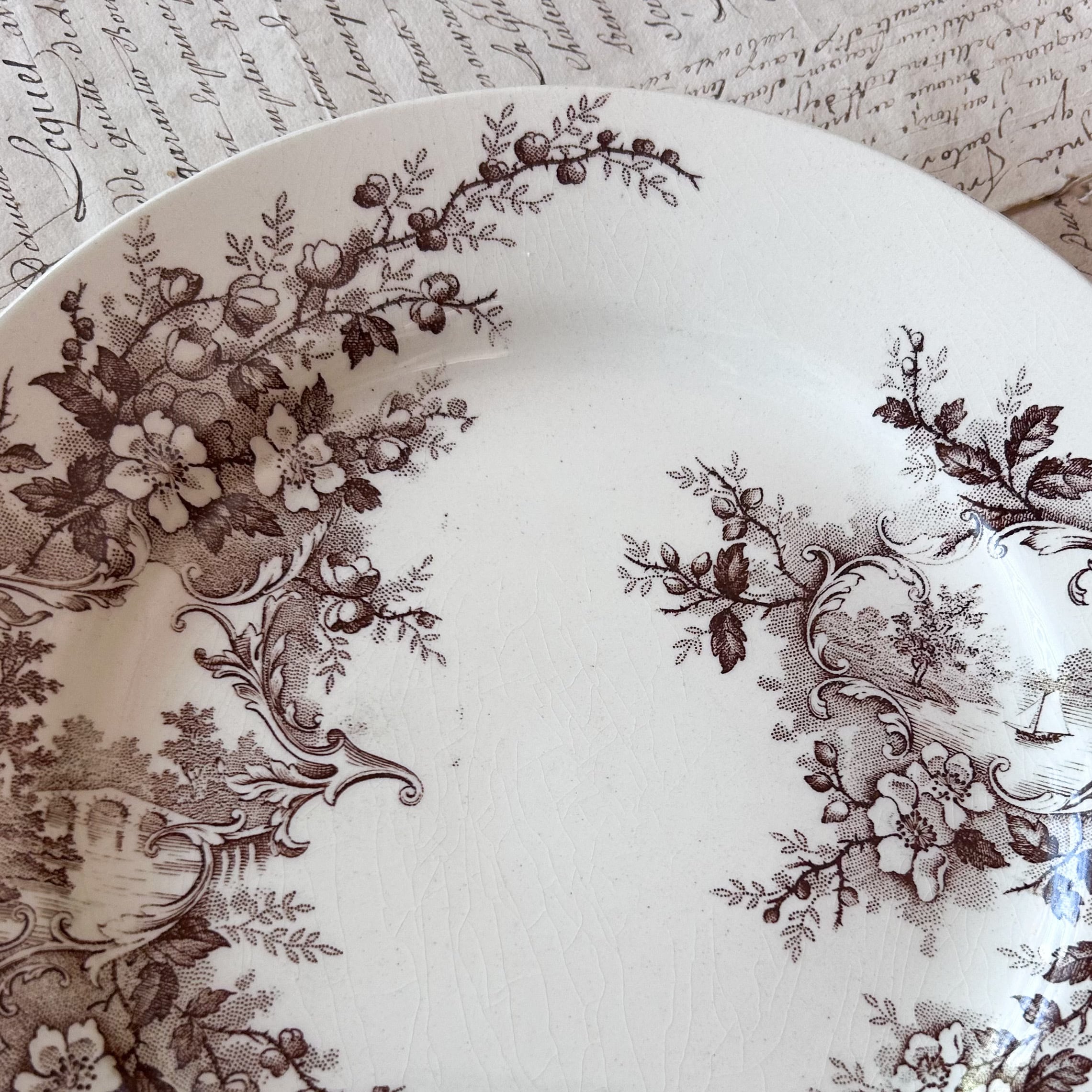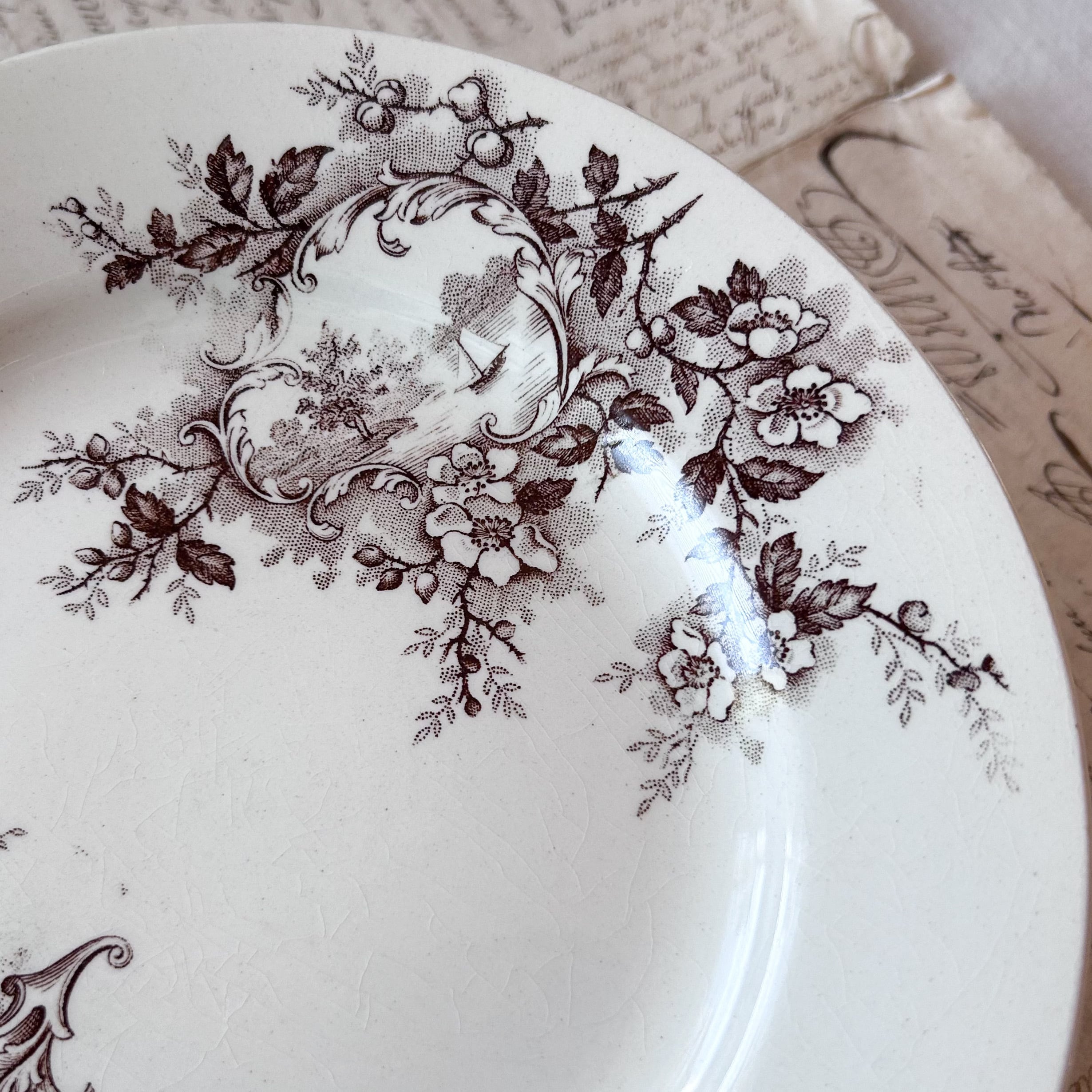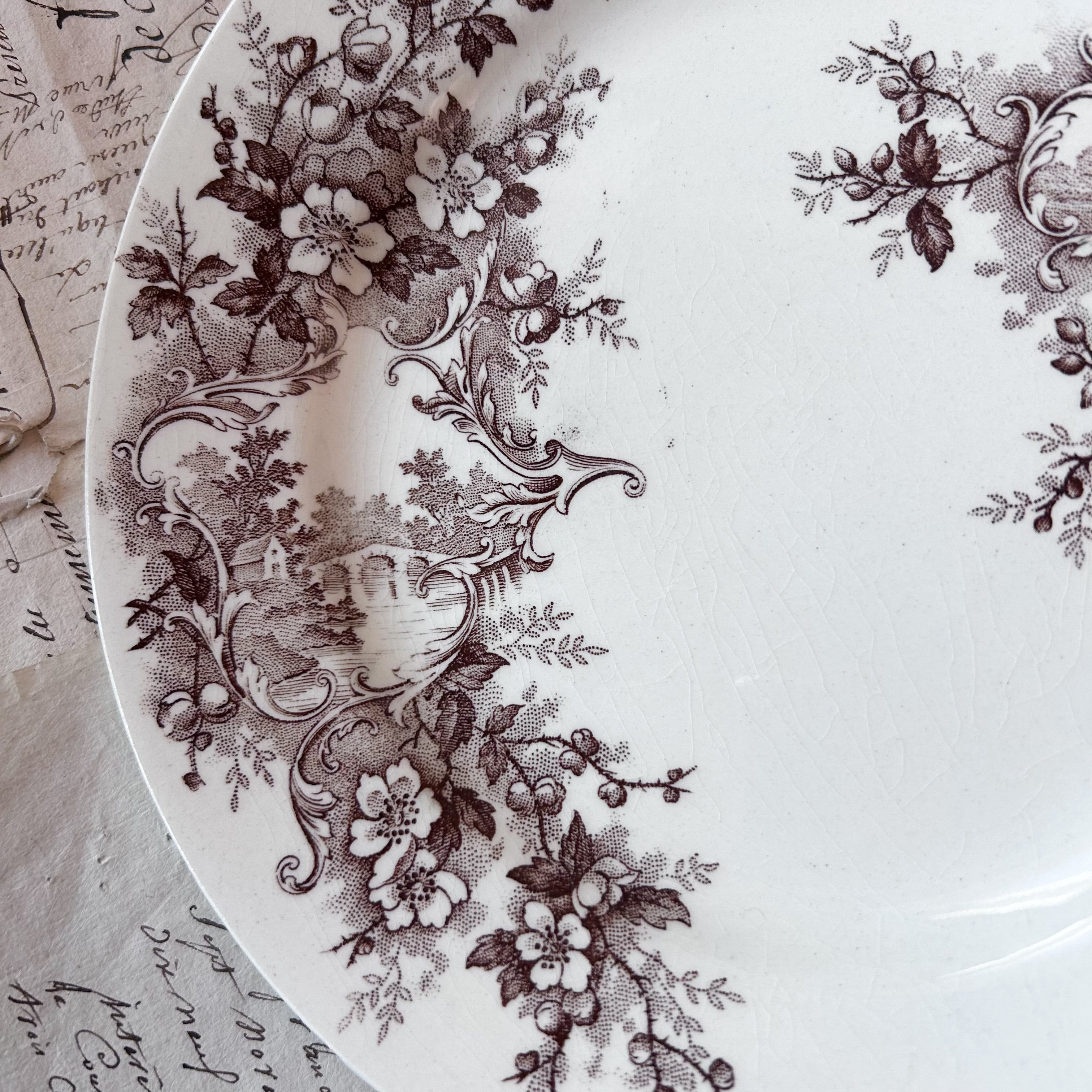 深みのあるブラウンで転写された花とロカイユ装飾、そして風景画が織り込まれた優雅なプレートです。クラシカルな花のブーケやスクロールの中に田園風景が描かれ、まるで絵画を切り取ったかのような芸術性を感じさせます。繊細な花々と柔らかな陶肌の組み合わせが、19世紀フランスのサロン文化を彷彿とさせる一枚。この「Pompadour (ポンパドール)」は、ショワジールロワを代表するデザインのひとつであり、コレクターや愛好家の間でも人気の高いシリーズとして知られています。飾っても使っても華やかさを添える、大変魅力的なお品です。