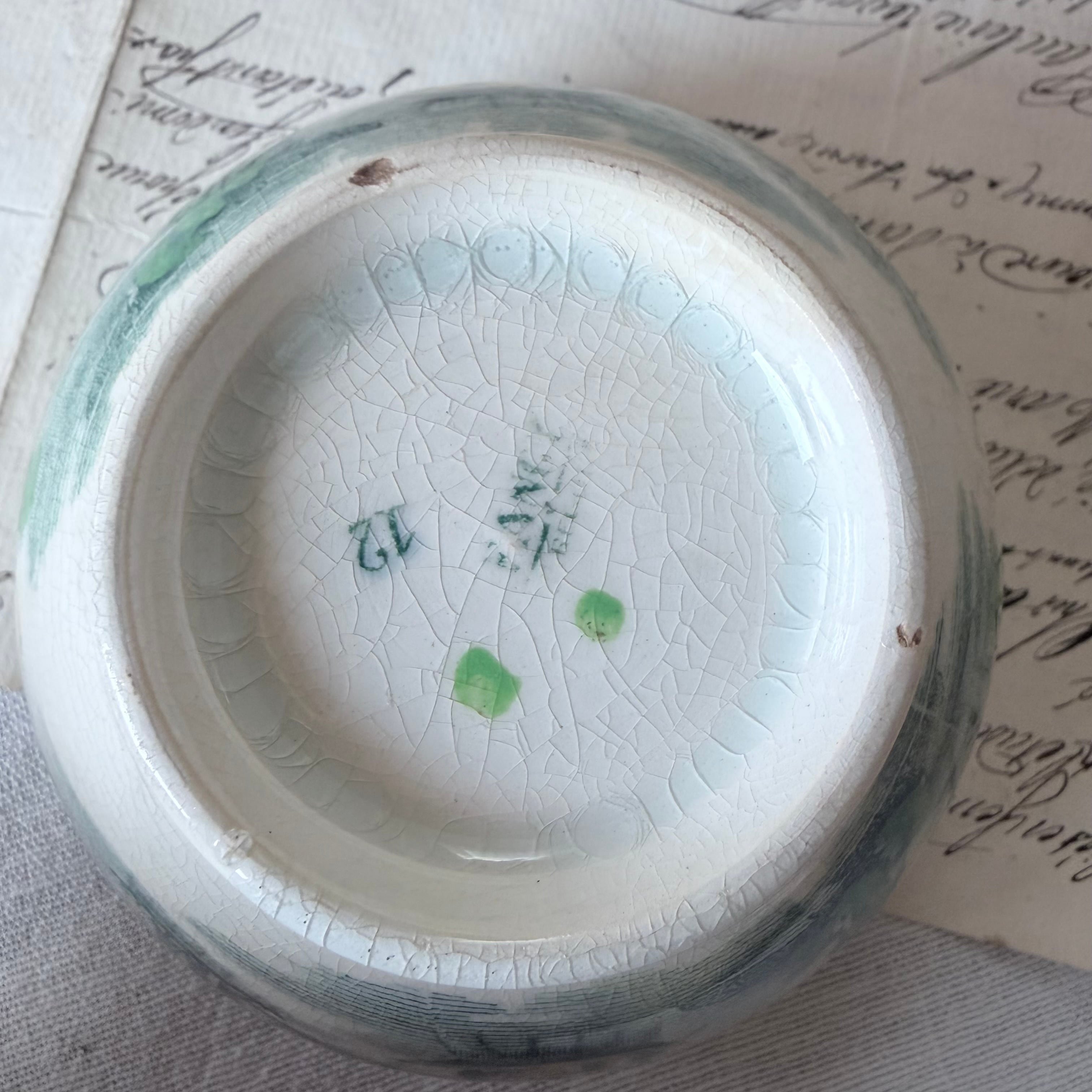 やわらかな乳白色の素地に、グリーンを基調とした繊細な装飾が広がり、どこか異国情緒を感じさせる佇まい。内側にも細かな文様と小さな風景画が描かれておりクオリティの高さを感じます。