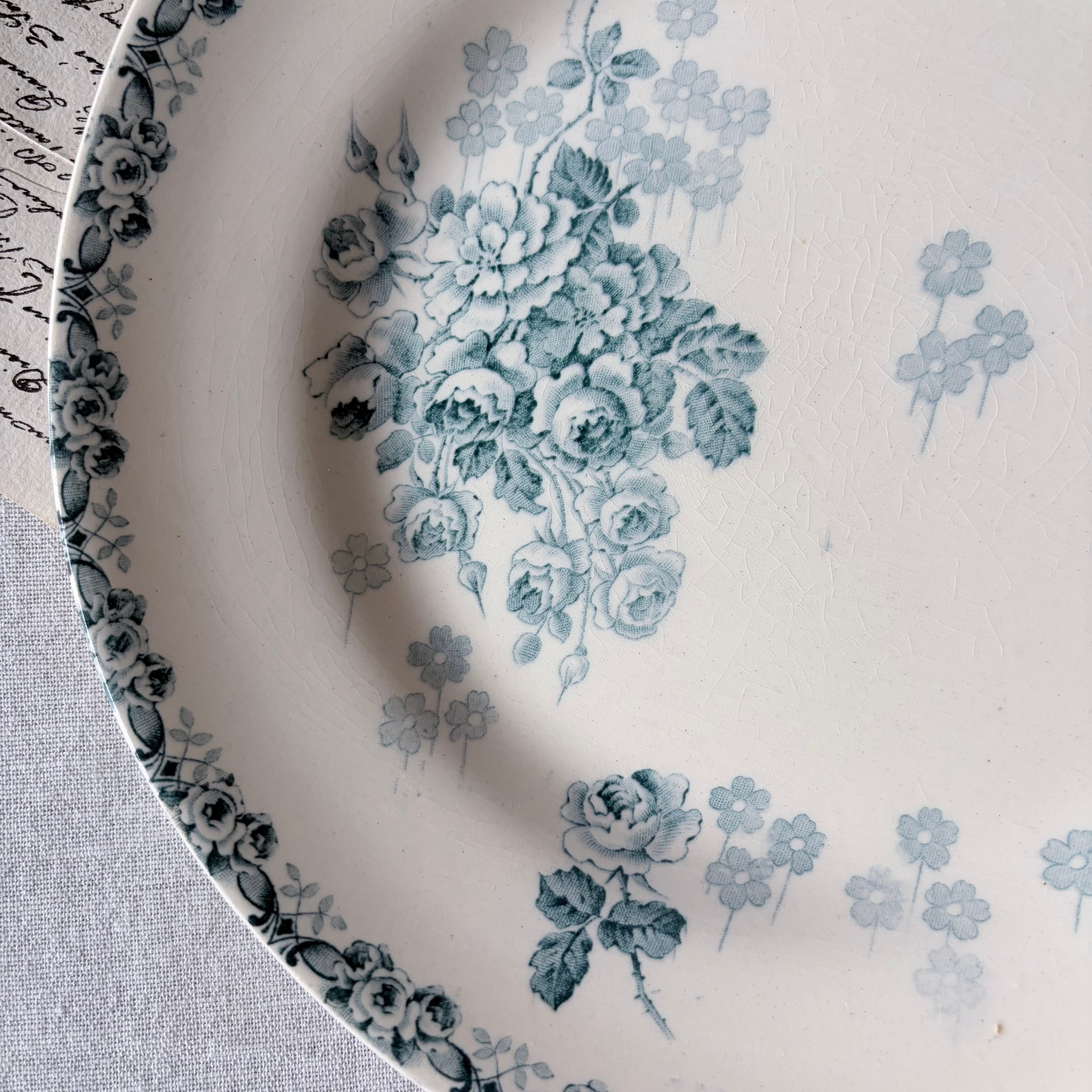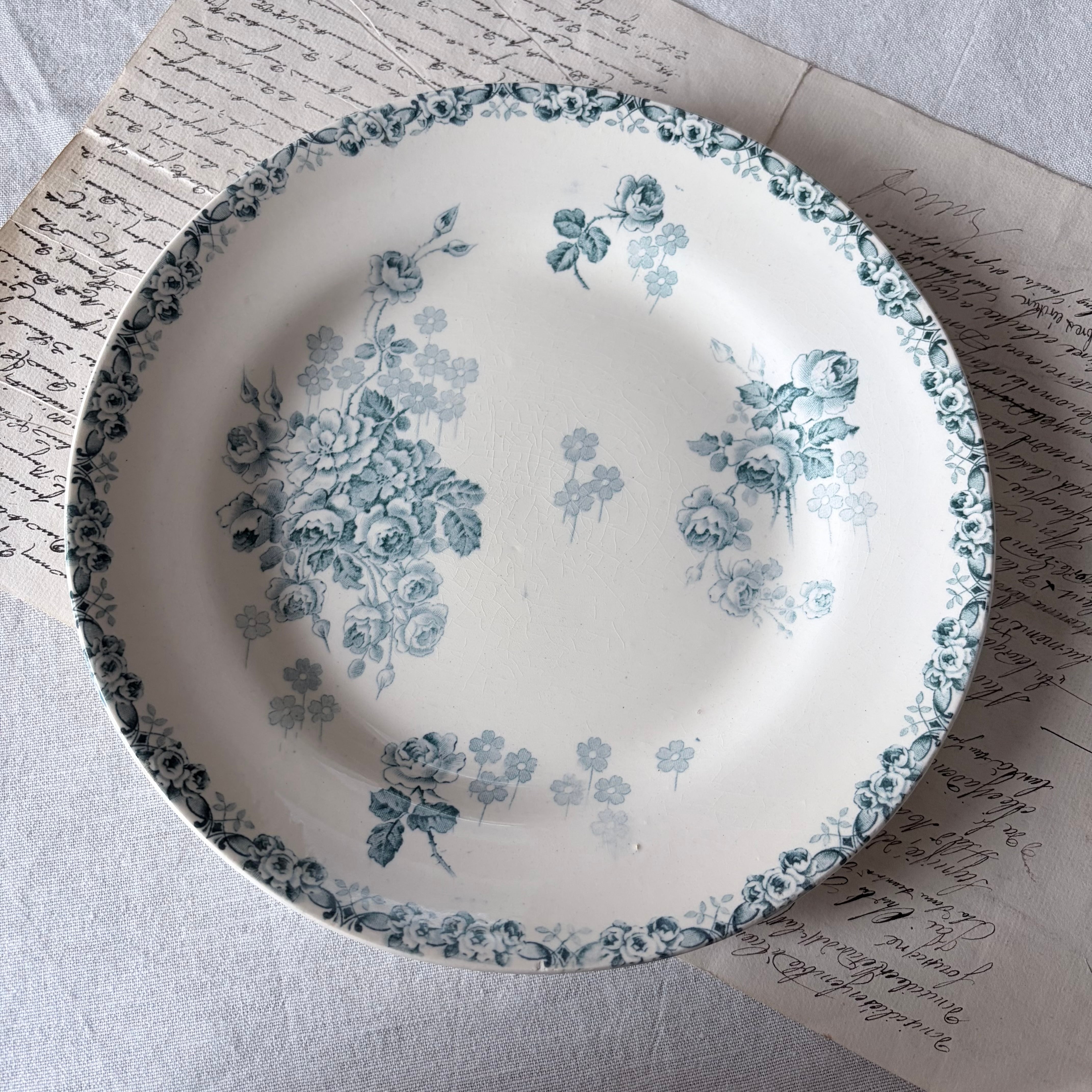 可憐な小花とバラがリースのように配置された上品なデザインが特徴のプレート。淡いブルーグリーンのトーンで描かれた花柄が、優雅で落ち着いた雰囲気を漂わせます。縁取りにも繊細なバラのモチーフが施され、フレンチアンティークらしい気品を感じさせる一枚です。